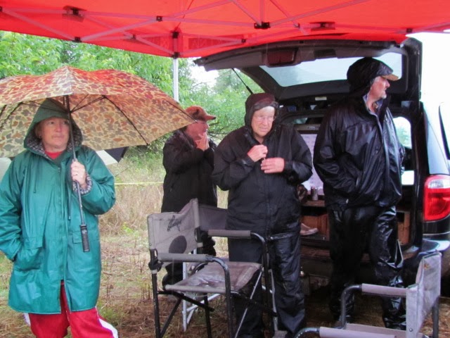 Flight A came to "Mitchell's Pond" for Test Five. They were greeted by wind, rain and slick driving conditions. The parking area for this test is small with everyone packed in to stay on a grassy surface versus the mud. The right hand bird is falling short today up on the bank in heavy cover or in with the tree roots. The ducks are being carefully dried after each use, but the combination of the wind, rain and water have made for a shorter flight out of the winger. This is the bird that has caused the most problems early on. The blind is a crosswind blind. Handlers are being very cautious to do this last bird correctly.